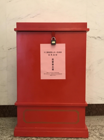 昨日,本報記者在人民大會堂中央大廳南側發現,全國人大十三屆一次會議大會秘書處會風會紀監督組已設立意見箱並公布監督電話,接受關於大會會風會紀工作的意見和建議,以及與大會工作人員、代表有關的會風會紀方面的問題舉報。監督組工作人員表示,這已是人大第二次採取這項舉措。