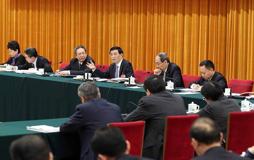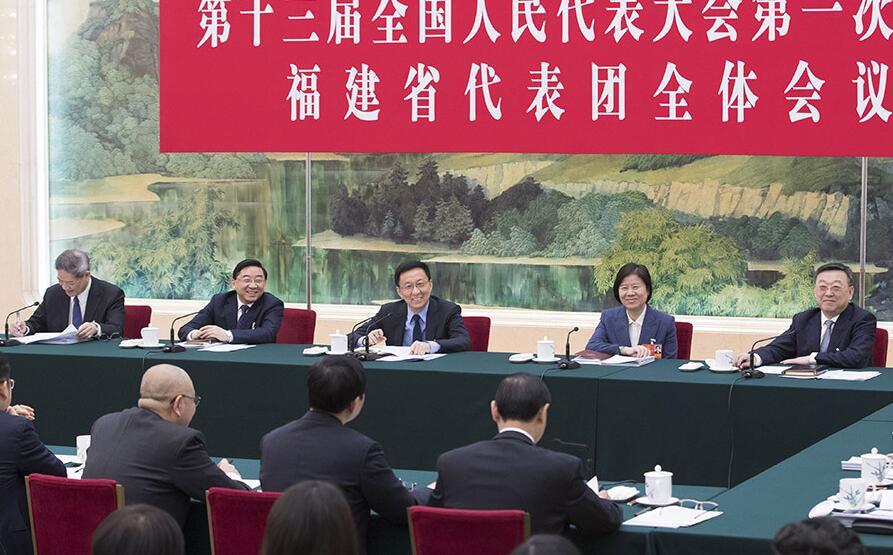 3月8日,中共中央政治局常委韩正参加十三届全国人大一次会议福建代表团的审议。 新华社记者 王晔 摄
