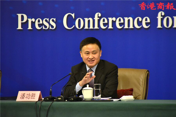 潘功胜回答记者提问。(香港商报记者 梁希贤摄)