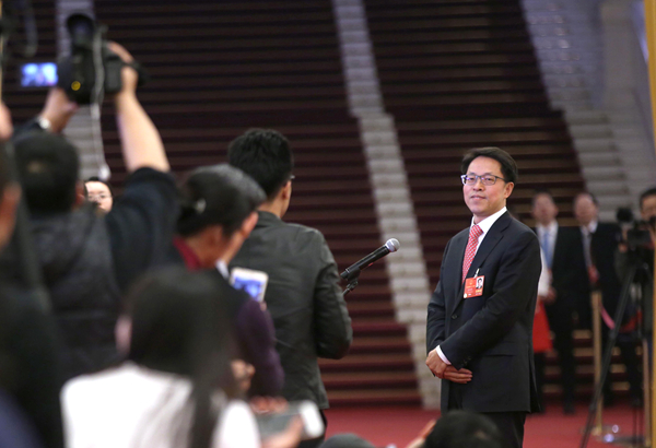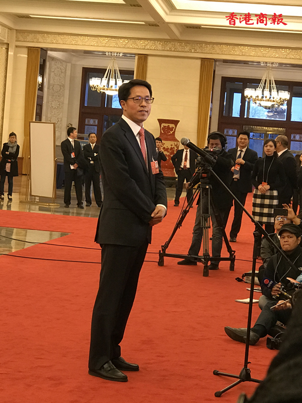 國務院港澳辦主任張曉明在「部長通道」接受採訪。 新華社