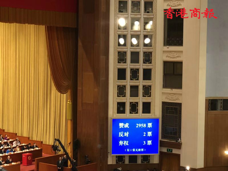 根据十三届全国人大一次会议表决议案办法的规定,表决宪法修正案草案,采用无记名投票方式,以全体代表的三分之二以上赞成票通过。经过约40分钟的发票、写票、投票、计票,15时51分,工作人员宣读计票结果:赞成2958票,反对2票,弃权3票。