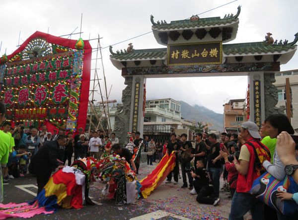 牌坊開光典禮開始前,麒麟隊陸續到賀。 記者 鄭玉君攝