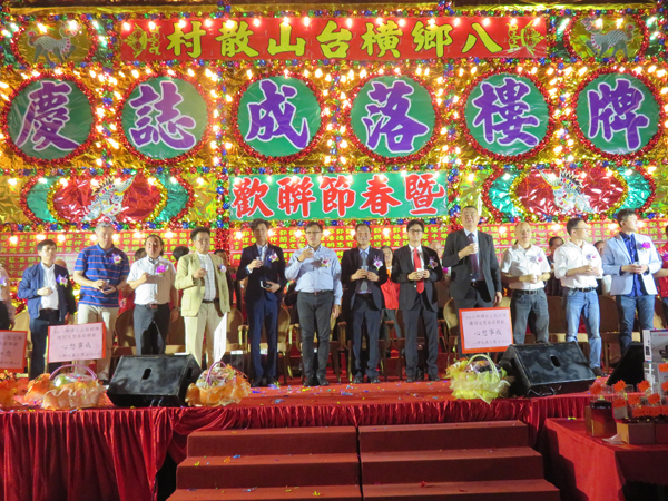 出席典禮的主禮嘉賓、立法會議員何君堯說,在城鄉發展過程中,新界鄉村無可避免受影響,但它們顧及社區和諧,以大局為重,作出好多犧牲,散村在高鐵興建過程中,順民意,收窄矛盾,態度正確,香港很需要這種共融、和諧及合作的態度。他強調,原居民一直支持特區政府依法施政,原居民的權益應根據基本法第40條徹底落實。另一主禮嘉賓、元朗區議會主席沈豪傑指出,牌坊是村民為國家和香港的貢獻印記,應感自豪。其他出席主禮嘉賓還包括八鄉鄉事委員會主席鄧瑞民、十八鄉鄉事委員會主席梁福元、屏山鄉鄉事委員會主席曾樹和、八鄉北區議員鄧鎔耀等。