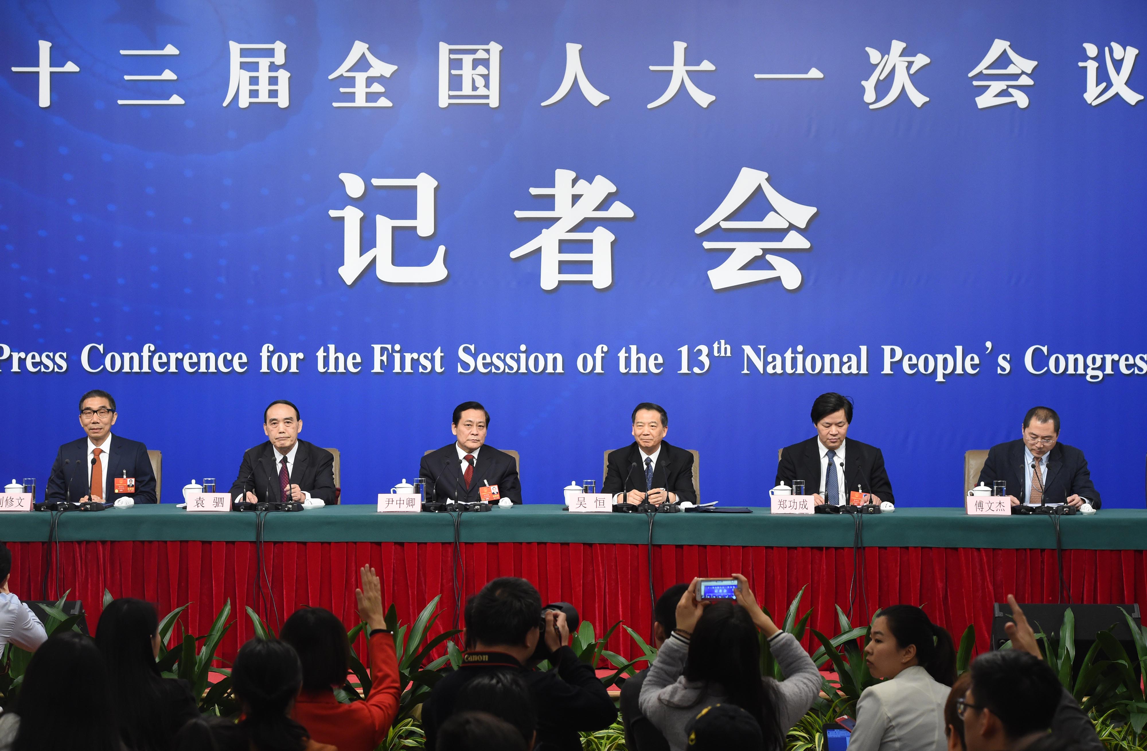 3月12日下午,十三届全国人大一次会议在北京举行记者会,十二届全国人大财经委副主席委员尹中卿、教科文卫委副主任委员吴恒、环资委副主席委员袁驷、内司委委员郑功成,全国人大常委会预算工委副主任刘修文、常委会办公室秘书局巡视员付文杰就「人大监督工作」相关问题回答中外记者提问。