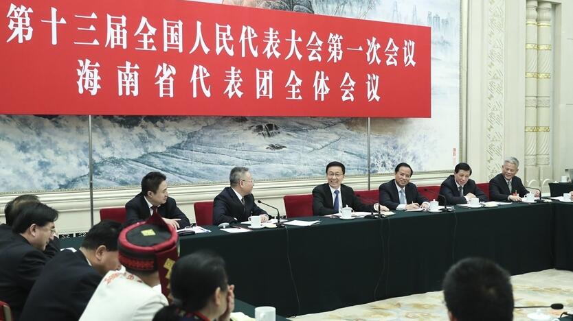 韩正在海南代表团参加审议。在认真听取刘赐贵、沈晓明、陈飘等代表发言后,韩正说,完全赞同全国人大常委会工作报告。报告围绕中心、突出重点、客观实在,通篇贯穿了习近平新时代中国特色社会主义思想,体现了坚持党的领导、人民当家作主、依法治国的有机统一。韩正说,海南在国家发展全局中地位作用更显重要,要以习近平新时代中国特色社会主义思想为指导,落实党中央决策部署和习近平总书记对海南发展的重要指示精神,以庆祝改革开放40周年和海南建省办经济特区30周年为契机,以国际旅游岛建设为总抓手,把保护生态环境放在优先位置,加快建设经济繁荣、社会文明、生态宜居、人民幸福的美好新海南。