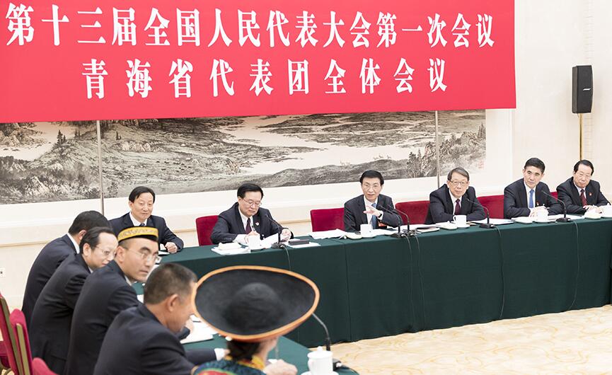 王沪宁在青海代表团参加审议。在听取王国生、王建军、张晓容等代表发言后,王沪宁表示,完全赞成张德江委员长所作的全国人大常委会工作报告。希望青海深入学习贯彻习近平新时代中国特色社会主义思想和党的十九大精神,在学懂弄通做实上下功夫,引导干部群众增强“四个意识”,坚决维护习近平总书记核心地位、维护党中央权威和集中统一领导。要聚焦实现高质量发展,加快传统产业优化升级,大力发展特色新兴产业,打好生态保护、绿色发展两张牌,打造青海发展新的增长点。要提高保障和改善民生水平,打好精准脱贫攻坚战,做好民族团结进步工作,增强各族群众的获得感、幸福感、安全感。要认真贯彻新时代党的建设总要求,全面加强党的领导和党的建设。