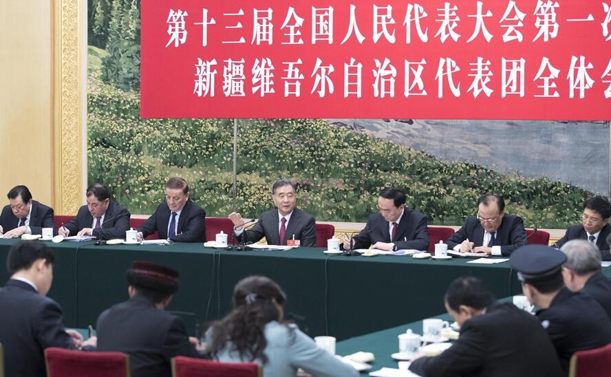 3月12日,中共中央政治局常委、国务院副总理汪洋参加十三届全国人大一次会议新疆代表团的审议。 新华社记者 王晔 摄