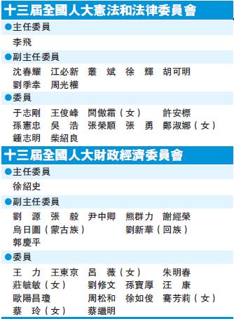 【香港商報網訊】本報兩會特派採訪組報道:十三屆全國人大一次會議第四次全體會議13日表決通過了大會關於設立十三屆全國人大專門委員會的決定,決定設立10個專門委員會。其中,李飛任全國人大憲法和法律委員會主任委員,徐紹史任全國人大財經委員會主任委員。