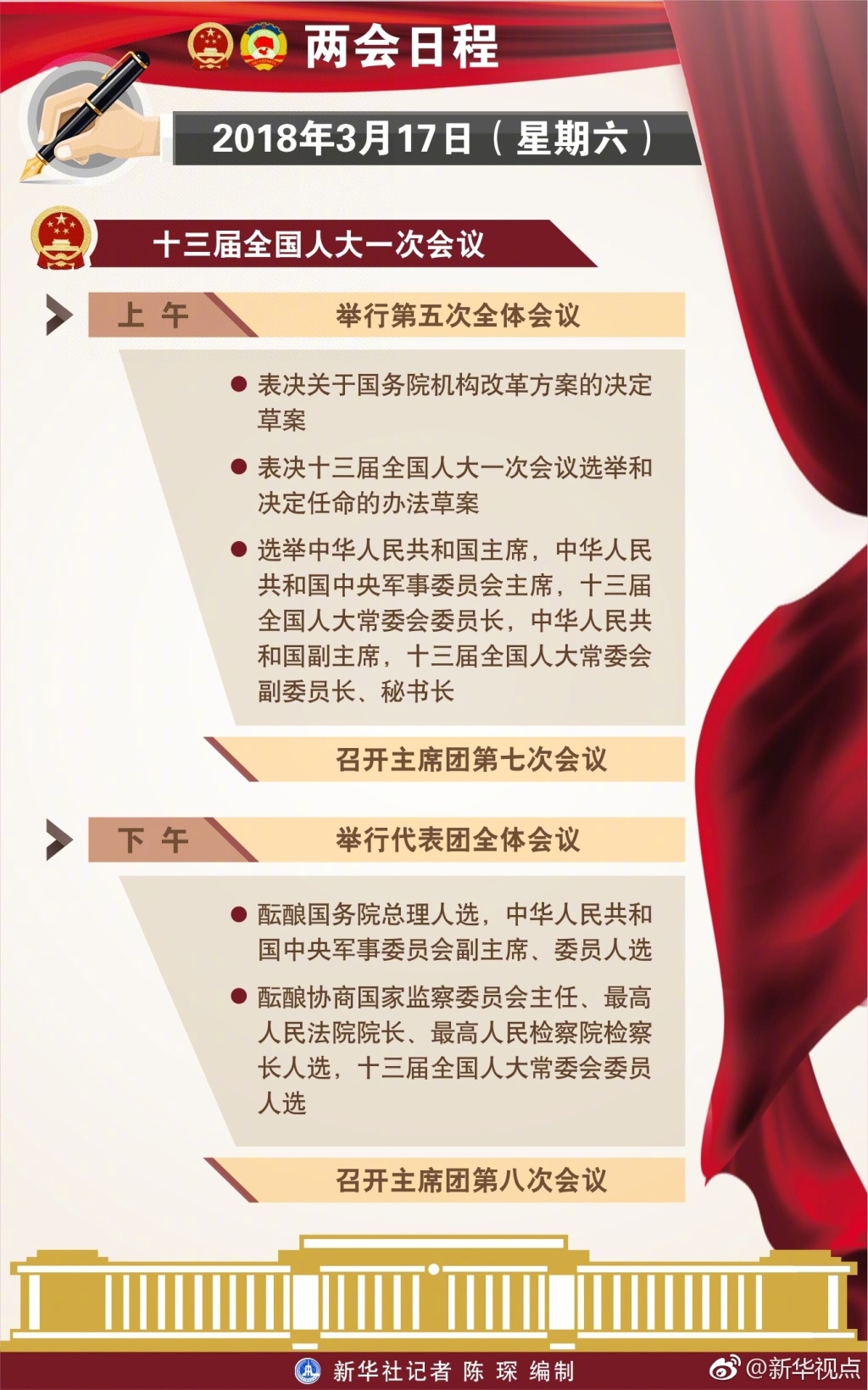 在明天上午舉行的十三屆全國人大一次會議第六次全體會議,決定國務院總理的人選和中華人民共和國中央軍事委員會副主席、委員的人選;選舉國家監察委員會主任、最高人民法院院長、最高人民檢察院檢察長和第十三屆全國人大常委會委員。