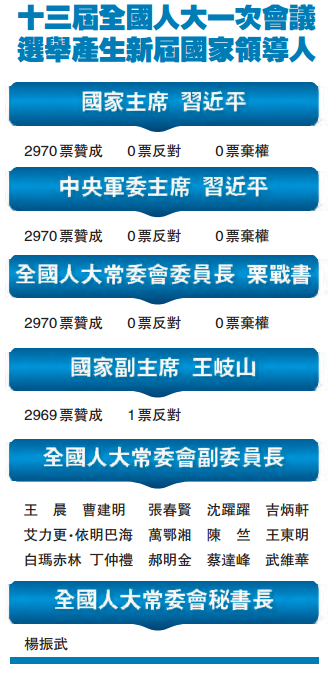 栗戰書當選為第十三屆全國人民代表大會常務委員會委員長;