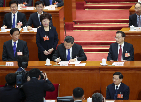 根據大會主席團關於憲法宣誓的組織辦法,全體會議各項議程進行完畢後,國務院總理李克強、國家監察委員會主任楊曉渡、最高人民法院院長周強、最高人民檢察院檢察長張軍,分別進行了憲法宣誓;中央軍委副主席、委員,全國人大常委會委員,分別進行了集體宣誓。