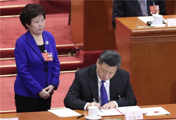 隨后,主持人宣布:根據憲法的規定,現在請國家主席習近平同志簽署主席令予以任命。