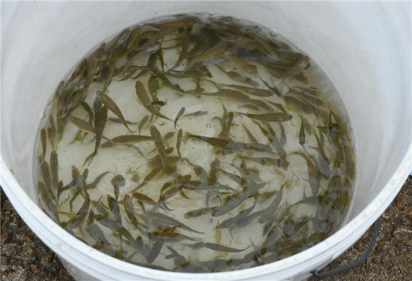 乘車大約一小時就到相思灣,灣岸滿布漂亮村屋,泰叔對這里的環境很熟悉,很快就找到位子泊車,跟住與太太穿上腰以上的防水靴褲,戴上笠帽,拿着膠桶、膠水勺、漁網及長竿,走落滿布大小石頭的海灣。兩夫婦在近岸處來回緩慢走動,當發現魚苗獵物,即快速張網圍捕,之后用膠水勺將魚苗連海水倒入桶內暫養。大約走了半小時,他們暫時鳴金收兵,數一數桶內魚苗,烏頭魚苗只有數百條,果然是尾水那批魚,量很少,泰叔說,很多都游回大海了,况且海水有些紅潮,不利魚兒埋岸。