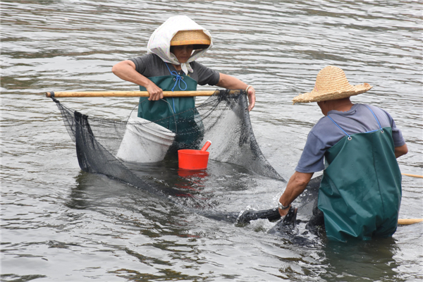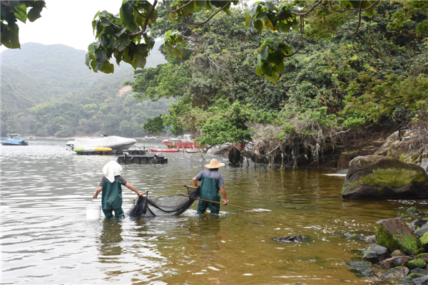 泰叔偕妻子在相思湾岸边捕捉鱼苗。