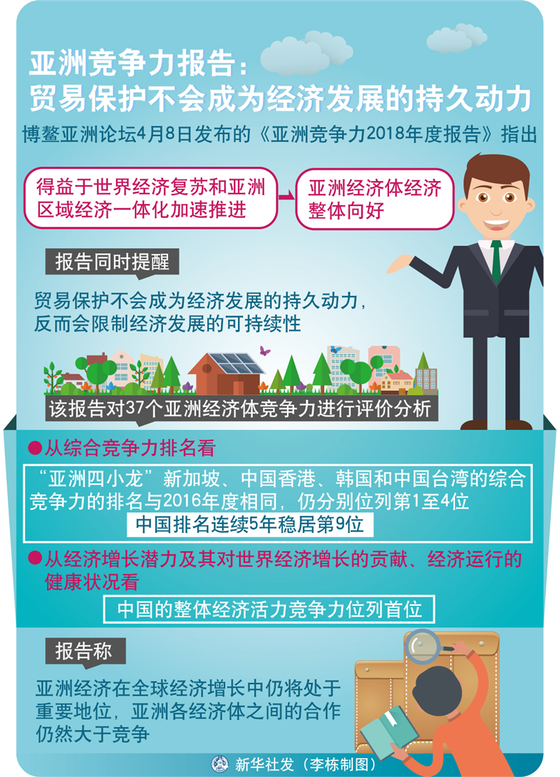 【香港商报网讯】根據博鰲亞洲論壇2018年會發布的亞洲競爭力報告,中國在亞洲經濟體綜合競爭力評估指數排名連續5年穩居第九位。博鰲亞洲論壇2018年年會新聞發布會暨旗艦報告發布會昨日舉行,會上發布了《亞洲經濟一體化報告》、《新興經濟體報告》、《亞洲競爭力報告》三大學術報告。《亞洲競爭力2018年度報告》指出,得益於世界經濟復蘇和亞洲區域經濟一體化加速推進,亞洲經濟體經濟整體向好。報告同時提醒,貿易保護不會成為經濟發展的持久動力,反而會限制經濟發展的可持續性。