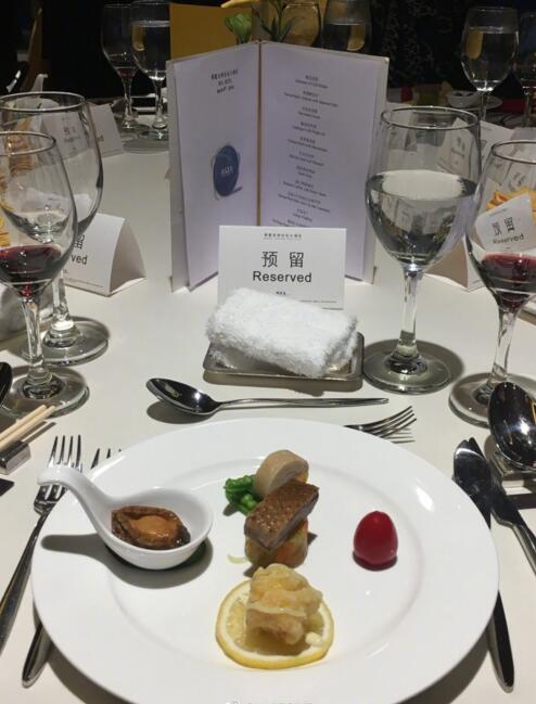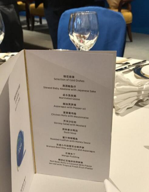 而晚宴菜单则有:锦花前菜、清酒鲍鱼仔、卤水温泉鹅、椒油莴笋塔、蛋黄酱鸡卷、芥末沙拉虾、雨林参水鸭、蜜汁烤银鳕鱼、东坡小牛肋搭百合鲜芦笋、芒果布丁、椰奶红豆卷拼热带鲜果。
