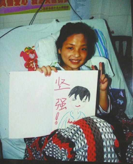 照片上,躺在病床上的何亚军手里拿着一幅画,上面用红笔写着“坚强”,她笑着比出v字手势。那是地震不久后拍的,当年她才11岁。