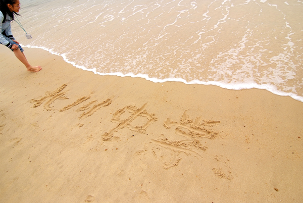北川中學學生在淺水灣沙灘上駐足嬉戲,向大海問好。