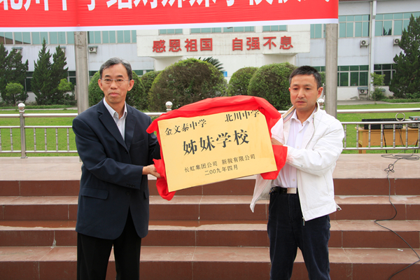 終於在「5.12」一周年前一個月即2009年4月,金文泰中學和北川中學在長虹培訓中心北川中學臨時校舍,簽了一個正式協議。劉亞春、李國佳兩位校長就在露天,在一張學生用的小課桌上簽字蓋章。參加儀式的,還有時任金文泰中學副校長李瑞華,「連家長教師會的畢主席都去了,因為我們要得到家長的支持才行,我和長虹的副總經理郭德軒作為見證人也參加了儀式,我們還合做了一塊銅牌,現在這塊牌還放在金文泰中學校史館,我們在患難時建立了姊妹學校關系。」