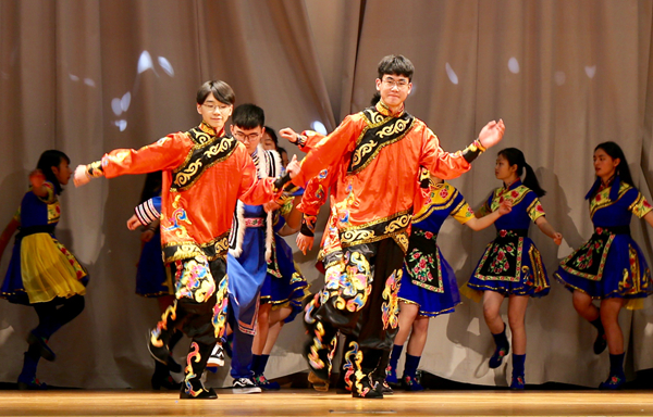北川中學參加2018金文泰中學開放日的同學在台上跳起歡樂的羌族舞蹈,與香港同學分享開放日的喜悅。