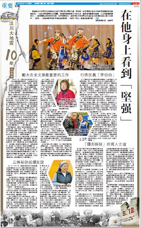 每天買牛奶和麵包給北川學生做早餐,密切的接觸使得現在還有北川學生跟鄭太保持着聯繫。鄭太提及交流對金文泰同學的影響,「當時我們有6個學生作為接待者,其中一個是陳伯華,后來也跟着我去過北川。他在最后一屆會考的成績是9A1B,他想當科學家,后來進了北大念物理,現在在哈佛讀博士生。」她特別提到,「當時香港都有一些很有心的老師,我們上去北川時發現有一個香港一間中學的英文老師,她原本只是打算在地震后的那個暑假到北川支教,但是她真的很想幫當地的這些同學,所以就留下來了,我們2011年4月上去的時候,她還在那里,可見那個時候很多人都很想幫助北川中學的學生。」