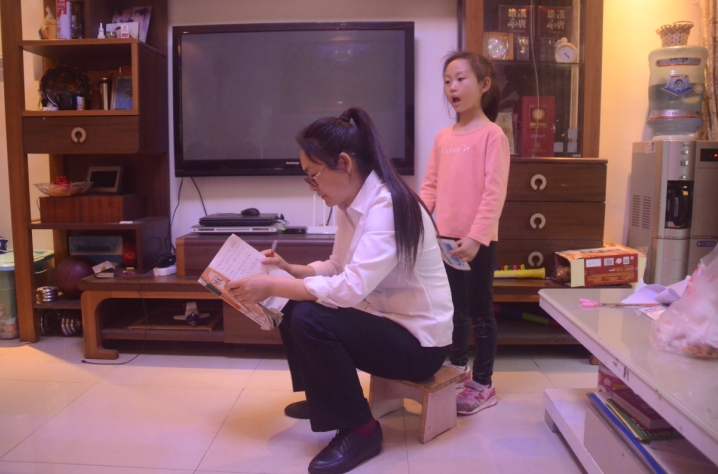 黄安蓉老师在检查蹇韵涵背诵课文 李颖 摄