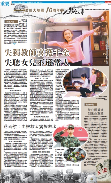 談及地震對他的最大影響,蔣雨航說:「我意識到生命的珍貴,會更加認真地對待自己的工作。2010年,我第一次報考軍校落榜了。但是第二年,我以第一名的成績考上了軍校。」