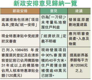 古洞(北)村民李肇華指出,新政安排對於該村希望上樓、補償這批住戶有吸引力,但住戶應該了解新政安排存有多個疑問,首先是免經濟狀况審查,其經濟狀况涵蓋不清晰,通常只有資產、入息及物業三類,不知政府指哪一類。他找過很多文件都沒有找到經濟狀况答案,而取消現行60萬元的核准特惠津貼金額上限并實施100平方米的面積上限的規定,以按合資格構築物的面積計算核准特惠津貼的金額,他指出,該村占90%住戶,其最大面積近40平方米,即使按照原東北發展特別項目方案補償60萬元,這批住戶亦僅獲全額補償逾48萬元(見意見表)。