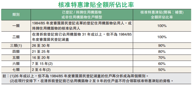 而新政安排下,已被列入1984/85年度寮屋居民登記及在清拆前登記前,已占用構築物31年或以上的住戶可獲全額補償逾42萬元。另外,五類獲補償視乎居住年限,獲核准特惠津貼全額的百分比率(見表),他是政府核准居住有3年,但還要具備2個條件,需有當年簽字居住文件,外面無物業才能獲這筆補償。新政安排對橫洲三村住戶無幫助,故此住戶仍要求原置劃地重建村,或按照各個新發展區補償和安置待遇,體現公平、公正、公益。