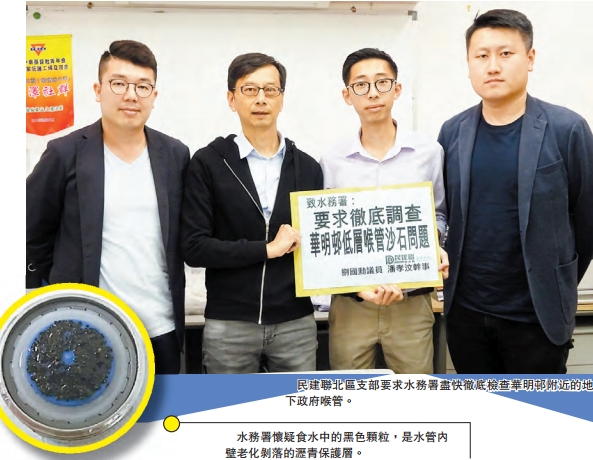 今年4月初,華明邨發生長時間停水,恢復供水後,不少住戶發現食水中出現黑色不知名的顆粒,受影響的包括禮明樓、信明樓、康明樓、富明樓及頌明樓,住戶均表示擔心影響飲用安全。