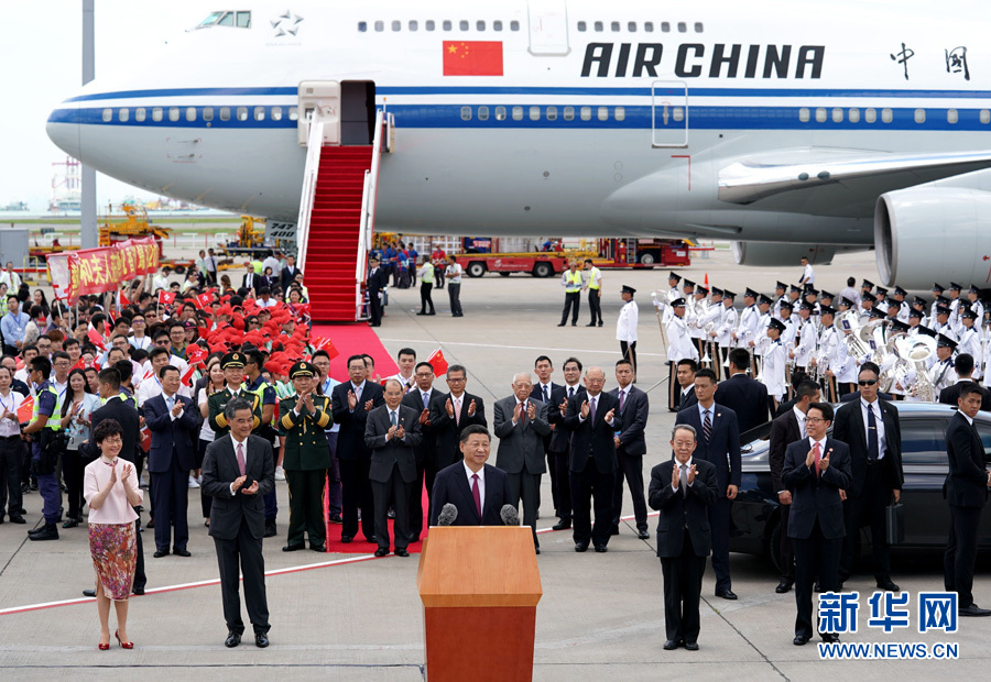 6月29日中午,中共中央总书记、国家主席、中央军委主席习近平乘专机抵达香港,出席将于7月1日举行的庆祝香港回归祖国20周年大会暨香港特别行政区第五届政府就职典礼并视察香港。这是习近平和夫人彭丽媛走出舱门,向欢迎的人群挥手致意。新华社记者 吕小炜 摄