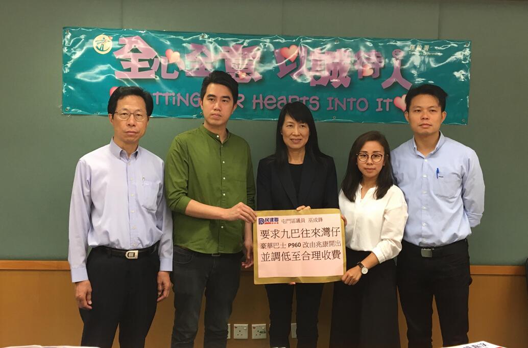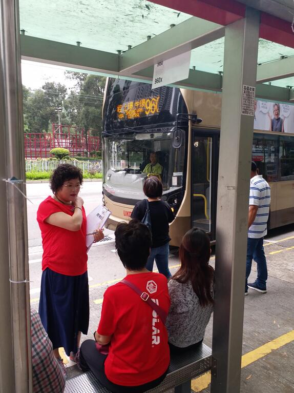屯門區議員程志紅分別在屋苑及巴士站,收集居民對960路線的意見。
