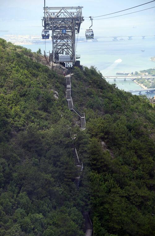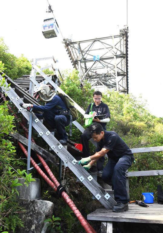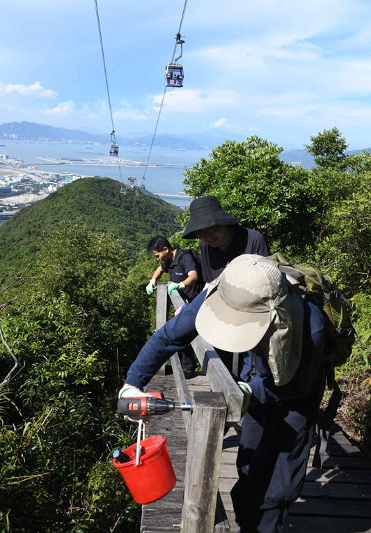 大約走了半小時,就到了如直插深谷的棧道樓梯級部分,這里十分開揚,纜車就在上空緩緩而過,遠處是機場,對行山人士而言,真的心曠神怡;在某些路段,還可聽到纜車內游人的歡聲笑語,饒有趣味。維修人員則無暇細賞,渾身是汗,到了3號纜塔,有木板鋪設的棧道結束,意味維修工作完結,正在喝水的李天培用兩個字作總結:「疲晒!」葉俊明統計這次共維修了約80塊木板,比以往算是少了。