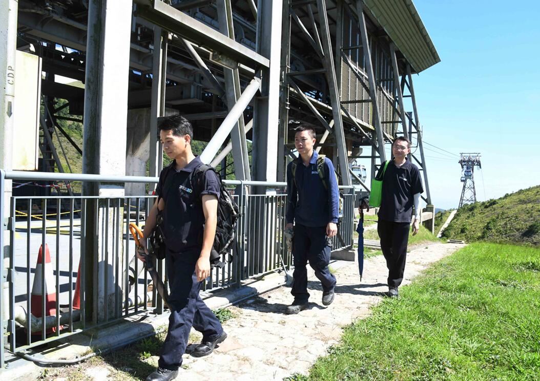 上月30日酷熱天氣警告下,維修設施部依時進行每月定期維修,記者跟隨視察。當天下午3時,昂坪氣溫27度,赤濸角更高達36度。站在昂坪纜車站棧道出入口,感熱氣逼人。兩名設施維修技術員李天培及陳兆宗將維修工具如電鑽、不銹鋼螺絲、不銹鋼片、保險絲母、士巴拿、玻璃膠、糧水和防曬用品等,逐一放進背囊內,重甸甸的裝備估計約有20磅,但他們說這已是較輕了,若要換木板,還要加進電鋸,抬着幾米長的木板條。而石徑有時會裂,更需要他們打碎石路,重新再鋪上。