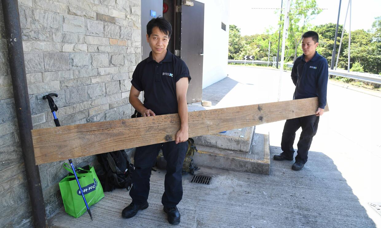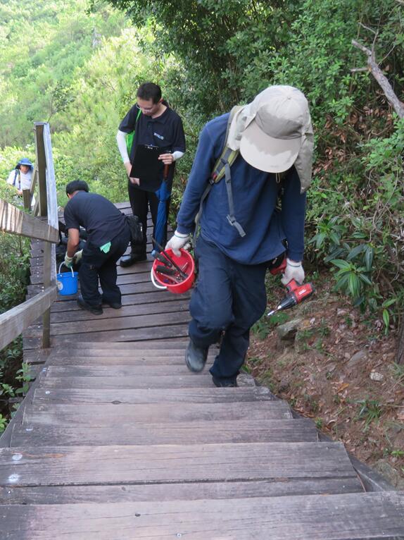 設施管理工程師葉俊明說,每月規定最少一次維修棧道,派出3名同事,維修時間約半天,會在維修日一星期前,盡量安排天氣好的日子,不太曬(40度以下)、不下雨,不過,如上午下雨,下午天晴也會上山,突發維修則須1至2天內到達完成,視乎工作要求。雖說盡量安排在好日子工作,但是山上天氣變幻莫測,難免要冒着雨俯身工作。因此必須做足預防措施,如帶備太陽油、手袖、傘、帽、噴霧、充足的水等,而組內同事年資平均也有3年和較年輕,直到現在工作還算順利,沒有人中暑。