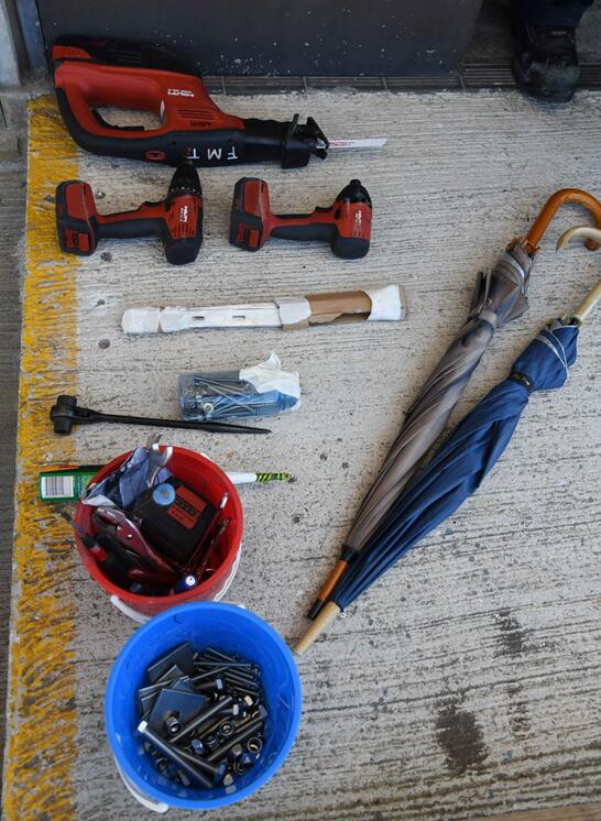 要揹負這些維修工具:電鑽、不銹鋼螺絲、不銹鋼片、保險絲母、士巴拿等,少點力氣也不行。