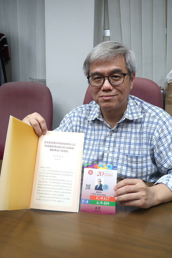 巢國明珍藏着去年出席回歸廿周年慶祝活動的嘉賓證和習近平主席「七一」講話的中英文小冊子。