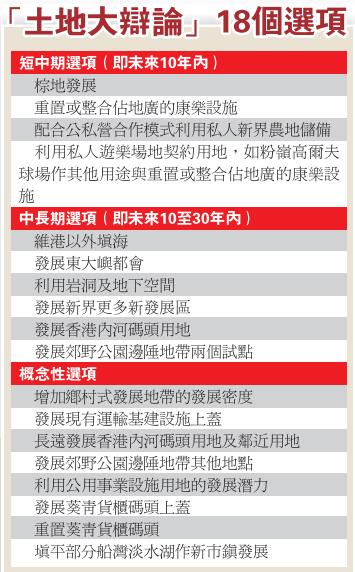 土地供應專責小組自4月起,就18個土地選項展開為期5個月的公眾諮詢,包括於維港以外填海、發展郊野公園邊陲地帶等,市民可透過問卷調查反映意見。小組主席黃遠輝承諾,會在撰寫報告時如實反映民意,並在今年聖誕節前提交給政府。