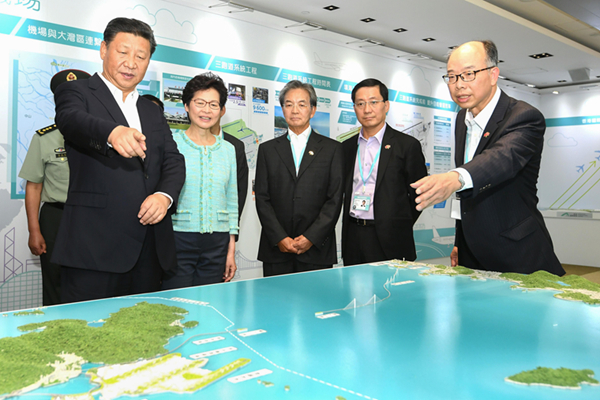 國家主席習近平去年來港視察期間,曾在行政長官林鄭月娥陪同下,視察主要基建設施,包括港珠澳大橋和香港國際機場三跑道系統工程的進展,並強調建設港珠澳大橋是中央支持香港、澳門和珠三角區域更好發展的一項重大舉措,是「一國兩制」下粵港澳密切合作的重大成果。