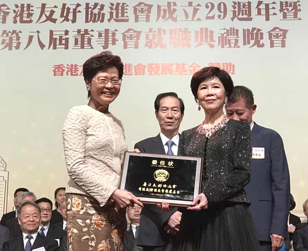林鄭月娥(左)為胡葆琳頒發香港友好協進會榮譽董事委任狀。