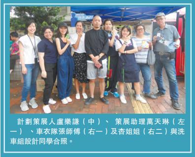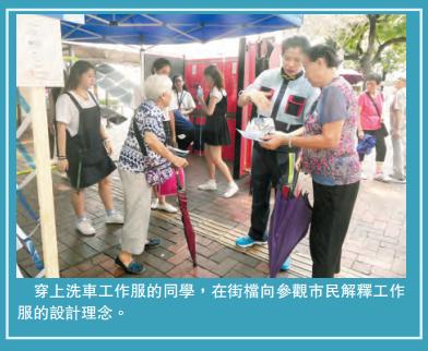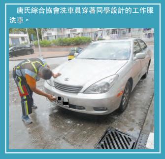 為香港唐氏綜合協會輔助就業中心(洗車服務)設計圍裙的同學,跟輕度智障洗車員學洗車,原本只須用30多分鐘洗一架車,因要教同學洗車,結果用上兩小時。同學從中了解洗車時遇到的問題,所以為他們設計充滿活力又實用的兩件頭工作服,上下各有兩個用透明膠料做的口袋,放置常用的小型洗刷工具;洗車時易沾濕的衣服中段加強防水防污功能,工作服背面採用透氣網布,加上綠色反光條方便戶外工作;洗車員不愛穿水靴,又怕弄濕鞋襪,防水長褲設計最適合。