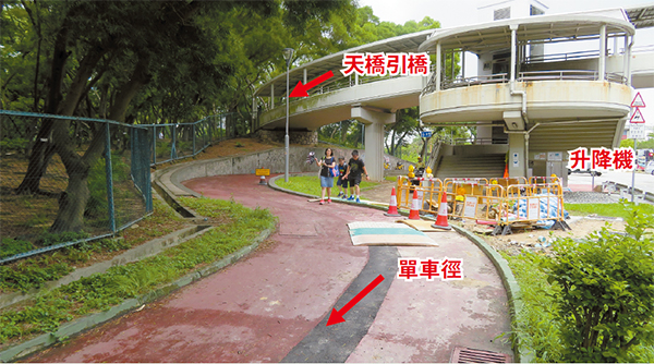故此,梁健文建議在升降機地下出入口於單車徑石壆處開闢路口,同時,在單車徑旁開通一條輪椅專用道至體育館,而由體育館而來的單車人士也可以借用升降機至人行天橋,以提升升降機使用率及便民。另外,政府盡快修建居民樓群一側升降機(已有規劃),短期措施在體育館範圍立標誌牌,引導輪椅人士由遊樂場至升降機。