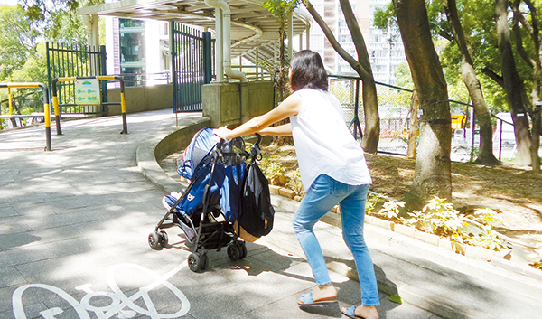 由遊樂場至湖山橋,嬰兒車同樣不能享用升降機,媽咪只能吃力推車至橋上。