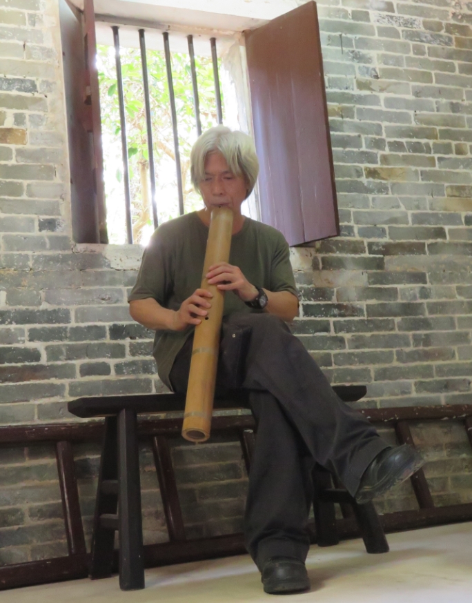 李文生愛收藏客家物品,也是一名藝術家,近來沉醉中式樂器,在鏡蓉書屋吹奏自製竹洞簫。 記者 鄭玉君攝