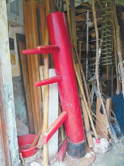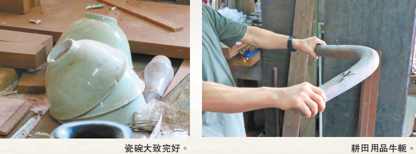 在這堆亂物中,有李文生打算用來創作的物料如木頭、天線杆等,但好大部分都是客家生活用品,農耕用具如犁耙、牛軛、穀斗、打穀機、竹籮、雞籠,家中用品如長板櫈、木衣箱、木門、瓷碗、酒埕,甚至木人樁也有。有些東西是村民祖先留下來,如枱櫈,有近百年歷史。