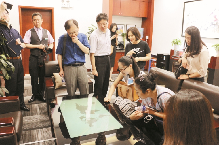 記者們紛紛對定西路支行的智能茶几感到好奇。