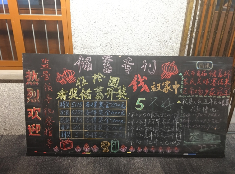 支在網點門口、用粉筆書寫的黑板報令記者感到特別親切。儲蓄欄目上公布有獎儲蓄的開獎信息;旁邊「錢放家中5不好」的內容吸引了不少記者的目光:一不好,日日夜夜把心操;二不好,手頭不緊易花掉;三不好,蟲蛀鼠咬要損耗;四不好,意外損失出所料;五不好,對己對國無功勞。存款板塊則顯示這個營業網點所在的縣1983年到1985年的儲蓄存款情況。