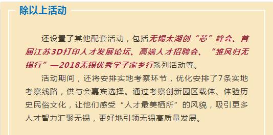 主体活动包括主题峰会、板块+人才+产业平行论坛、高层次人才路演活动、产学研洽谈会、人力资源服务高峰论坛、优秀学子家乡行等多种形式,强化“人才、项目、资本”深度融合。坚持产业导向,围绕物联网、智能制造、医疗大健康等领域,征集了海内外高层次人才项目639个,通过项目集聚、路演、对接等,为无锡产业强市提供“源头活水”。