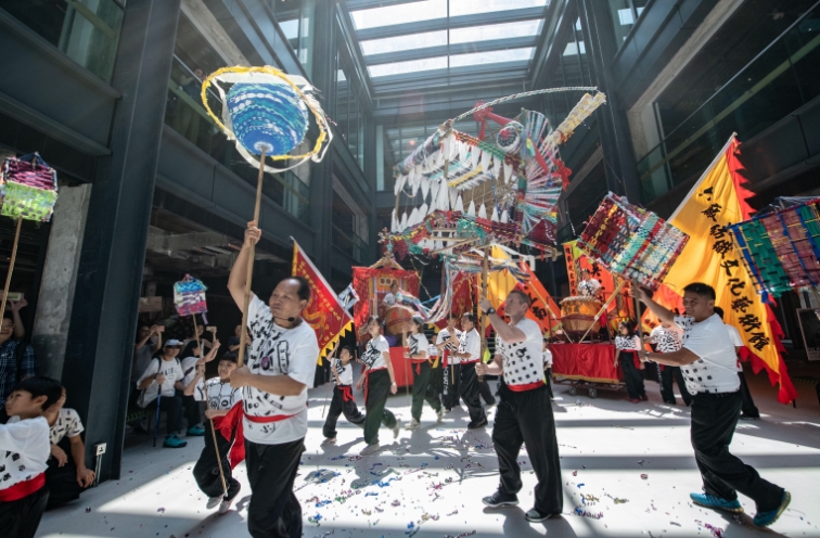 其中,「紡織村村公所」駐場藝術家田口行弘的「紡織龍」,於上月28日開幕禮當天,在香港仔舞火龍大師吳江南師傅的指導下,由50位參與織龍的大小朋友舞動。紡織龍靈感來自香港傳統火龍,歷時3個月,全長約35米。龍頭本身為一部田口行弘自製的手工紡織機;龍身則由35個不同大小的立方體組成,CHAT六廠自2018年5月起邀請超過600位公眾人士,以馬拉松接力的形式以回收布料及竹框合力編織而成。「紡織龍」編織活動仍繼續進行,為藝術館明年初的開幕禮作籌備,並將作為CHAT六廠的永久收藏。