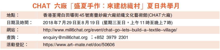 【香港商報网訊】記者奧加報道:荃灣南豐紗廠活化後的其中一個規劃項目是六廠紡織文化藝術館(CHAT 六廠),CHAT六廠於明年春季開幕,而開幕前的首個前奏活動是「盛夏手作:來建紡織村」夏日共學月,由7月29日至8月19日一連三星期舉行4大系列活動,而CHAT六廠亦向公眾特別開放三周。
